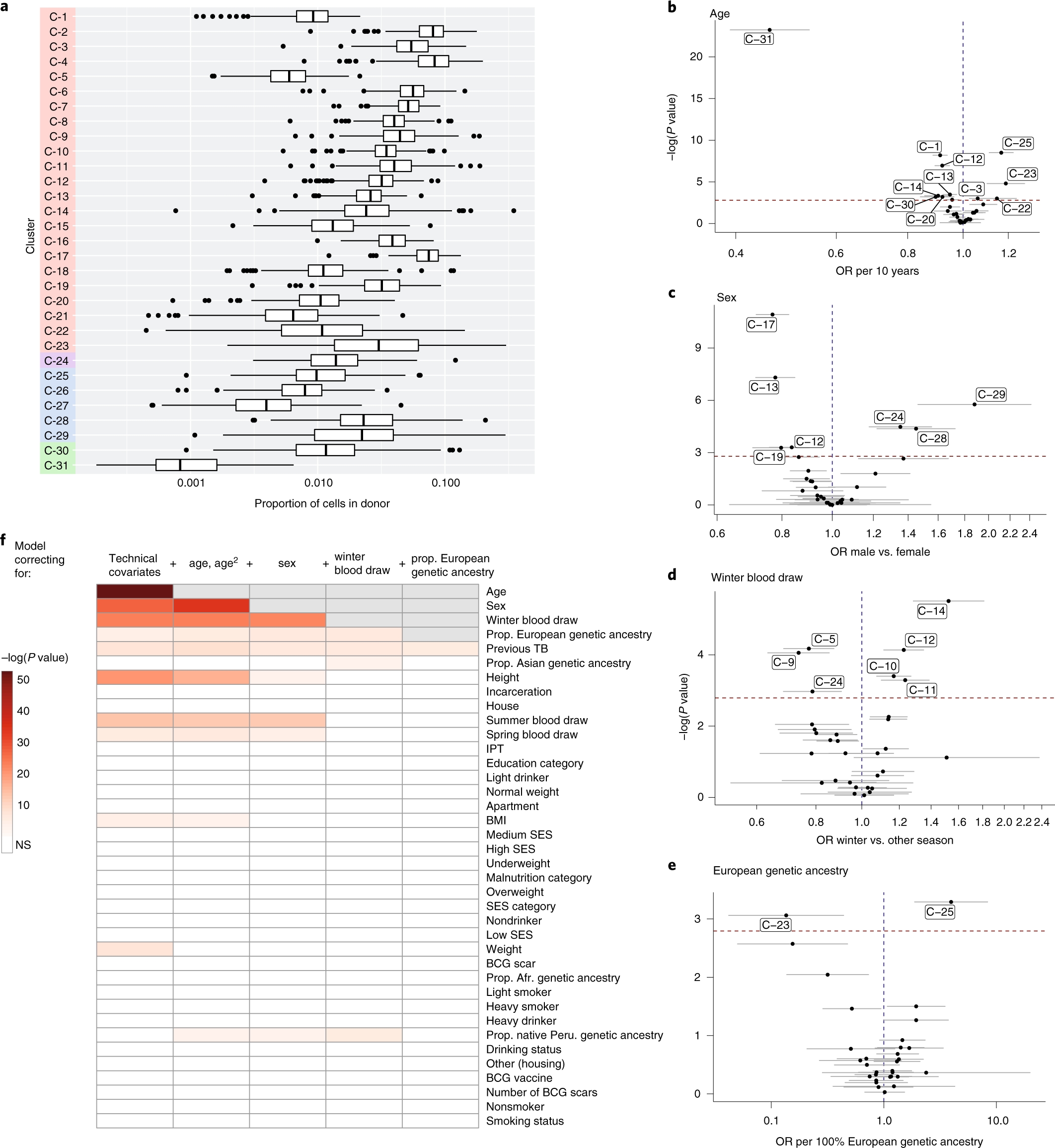探索每个细胞状态和肺结核病情进展的关系,同时校正其他可能存在影响的因素(年龄、性别、季节、遗传以及其他技术因素),发现: